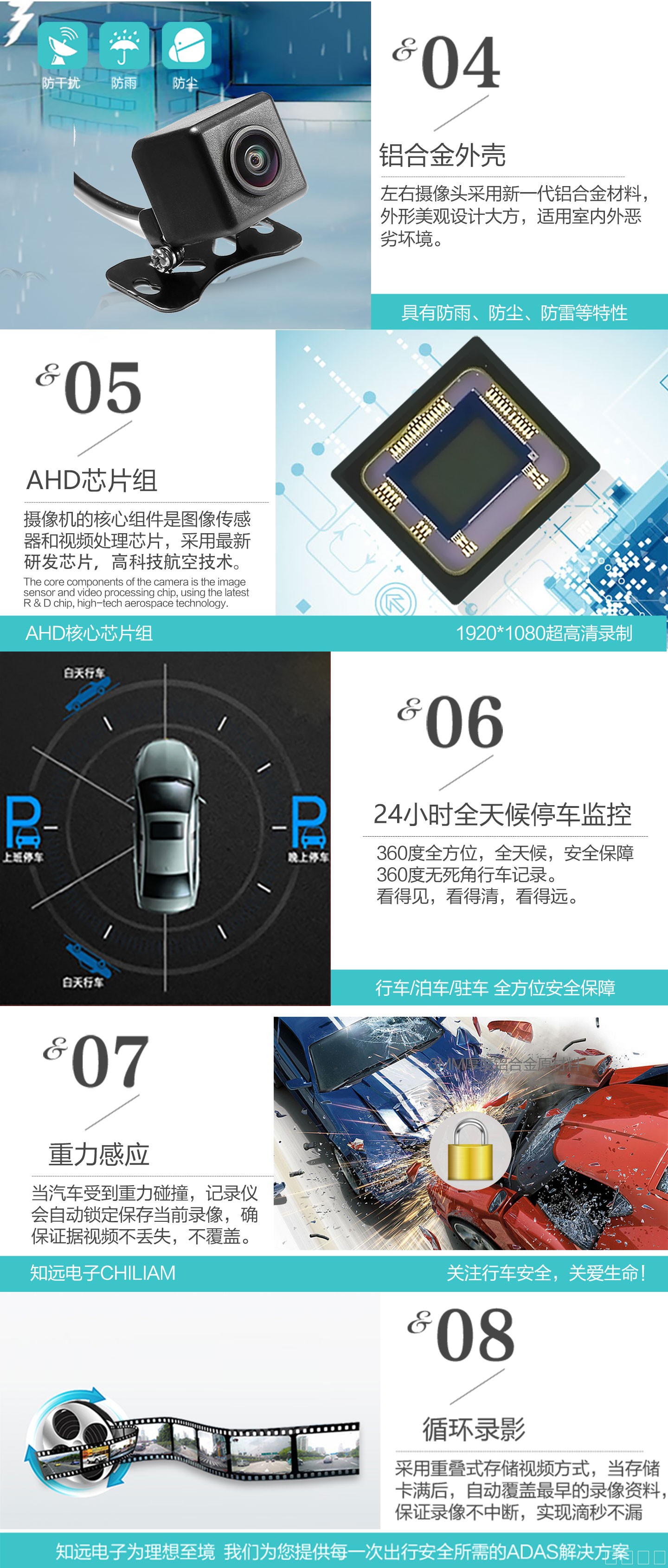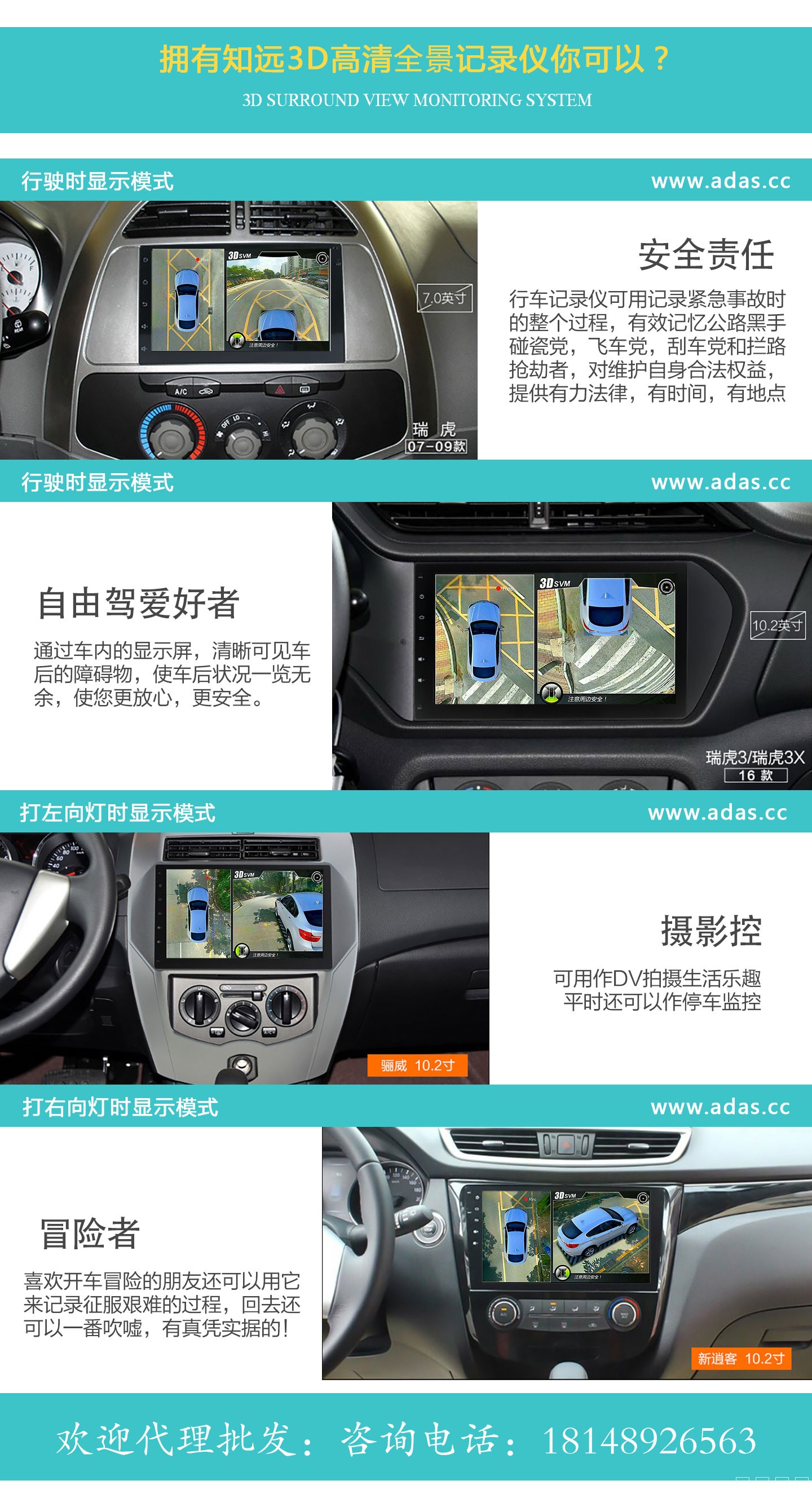 |  | 应用 侧边停车、倒车入库、狭窄路段、陡坡行车、低矮障碍、转弯盲区 特点 双核高速CPU、行车全景记录、智能四轮轨迹、停车震动监控、四角可视雷达、独特无缝拼接、倒车自动切换、倒车自动切换、特制广角镜头、环视全景视图、单图自由切换放大、专车专用镜头、睡眠待机保护、智能平面矫正、图文安装指导 汽车360°全景影像环视系统 360度环视全景影像,四面八方一目了然. |