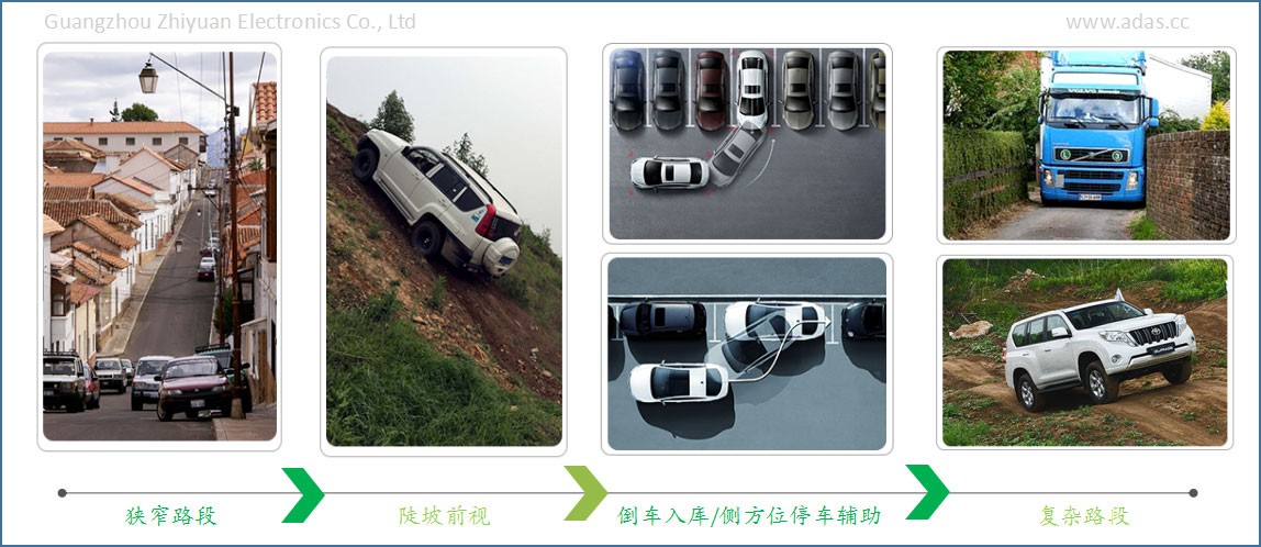 | 全景泊车系统可以为驾驶员提供低速、垂直停车、侧方停车、倒车、窄路进出、周边环境观察等几个典型场景下的辅助驾驶视角影像。通过与车辆总线的互连,系统可以通过车速,档位,左右转向灯,远光等信号,实现对视角/图像的快速切换,避免驾驶员出现“手忙脚乱”的情形。 | ||